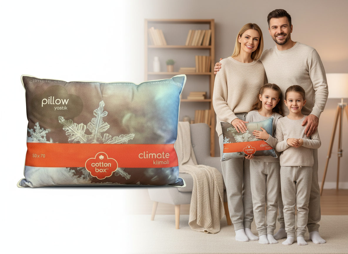 „Mit dem Climate-Kissen können Sie sich zu jeder Jahreszeit auf einen perfekten Schlaf freuen! Dieses innovative Kissen reguliert dank fortschrittlicher Klimasteuerungstechnologie automatisch die Temperatur und Feuchtigkeit. Dank intelligenter Sensoren, die im Sommer für Kühlung und im Winter für Wärme sorgen, gehören Schweißausbrüche und unruhiger Schlaf der Vergangenheit an.